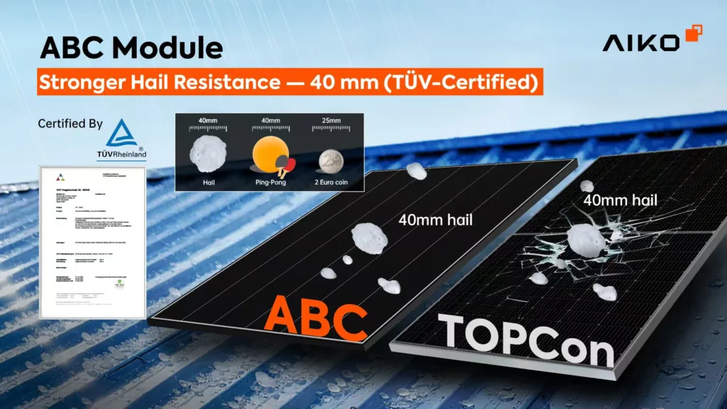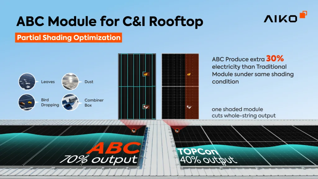 Questa configurazione porta a livelli di efficienza straordinari, con moduli che raggiungono fino al 24,2% di rendimento. Ma non si tratta solo di numeri teorici: i moduli ABC si distinguono anche per il loro comportamento in condizioni reali, in particolare in presenza di ombreggiamenti parziali. In questi scenari, grazie all’ottimizzazione del percorso di raccolta della corrente, un modulo AIKO può produrre fino al 30% di energia in più rispetto a un modulo basato su tecnologia TOPCon.